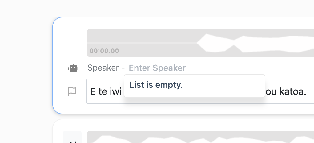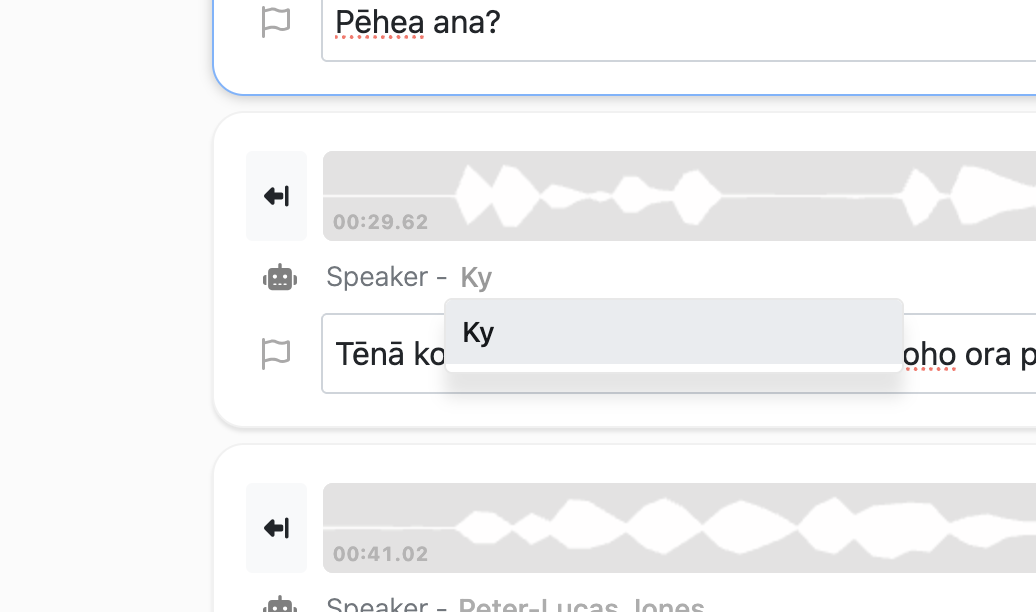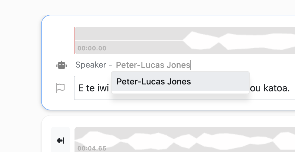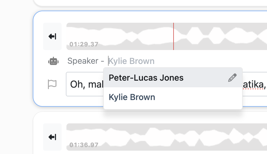 Once a speaker name has been added to the transcript - that name can then be selected from the dropdown speaker list.